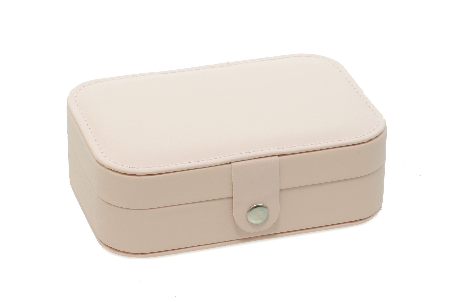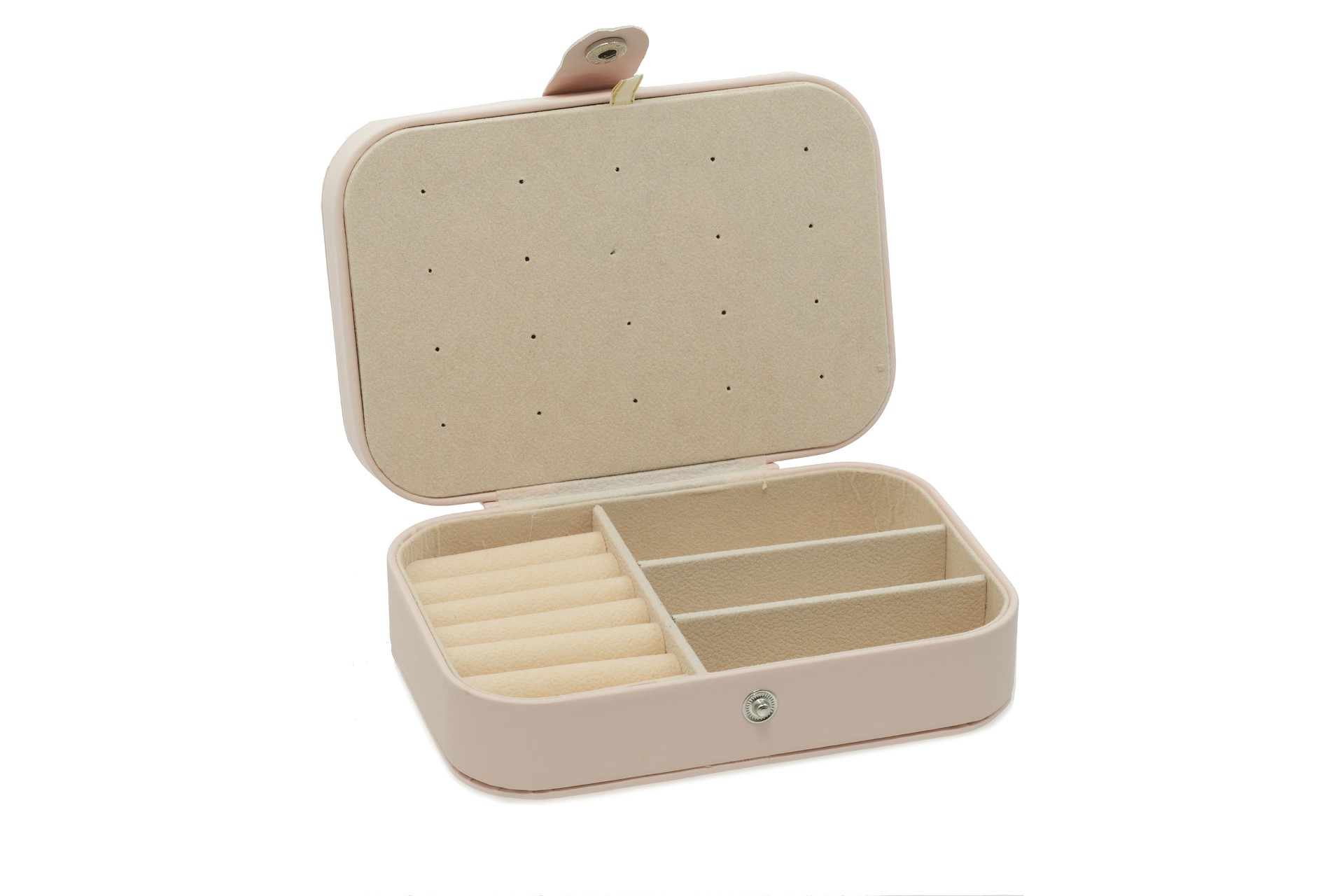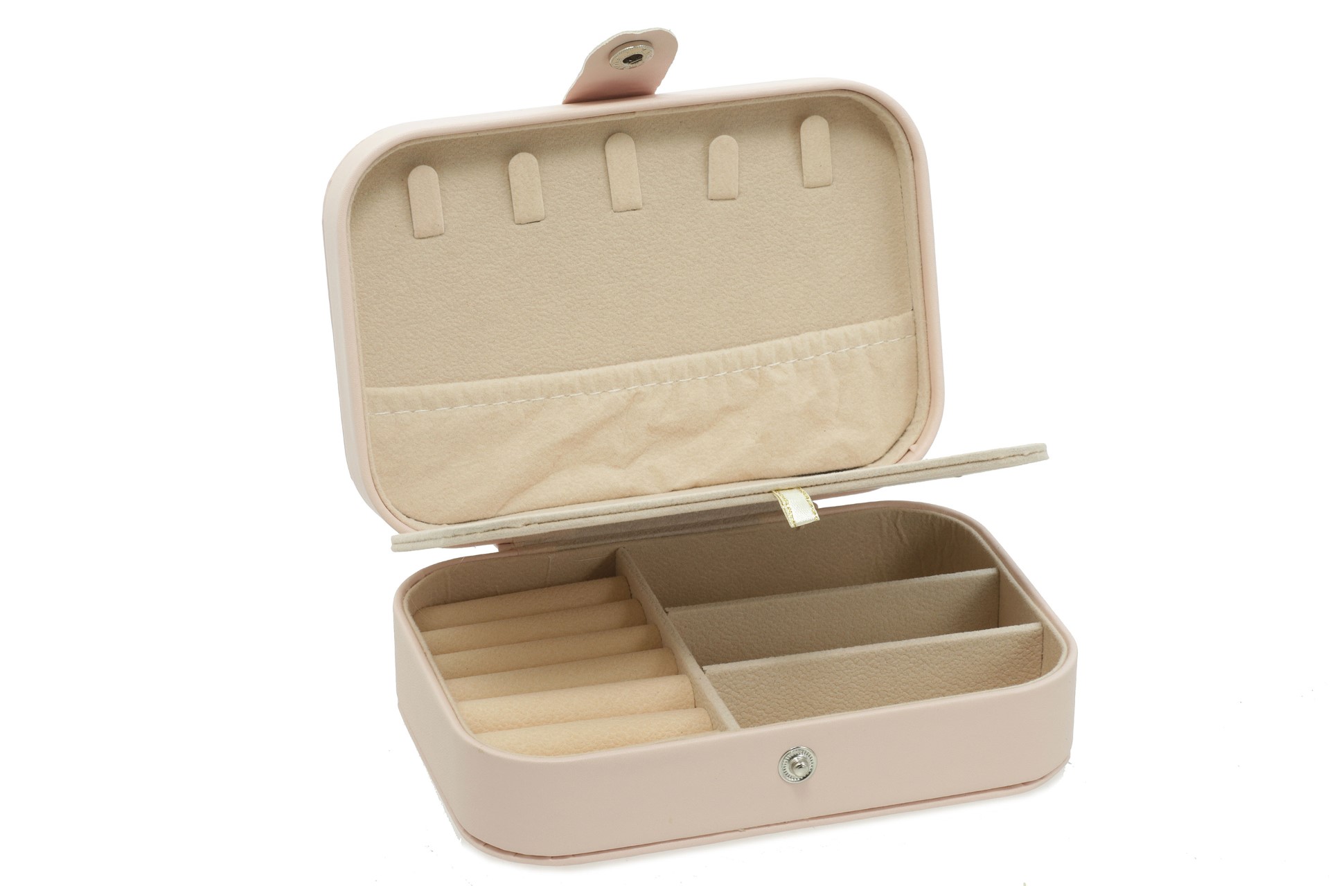 Κασετίνα οργάνωσης και φύλαξης κοσμημάτων 14 θέσεων με δερμάτινη υφή σε ροζ χρώμα, διαστάσεων 16*11*5 ΕΚ.. Οργανώστε και τακτοποιείστε τα κοσμήματά σας σε μια κομψή κασετίνα. Λόγω του μικρού μεγέθους της είναι ιδανική για να την πάρετε και στα ταξίδια σας