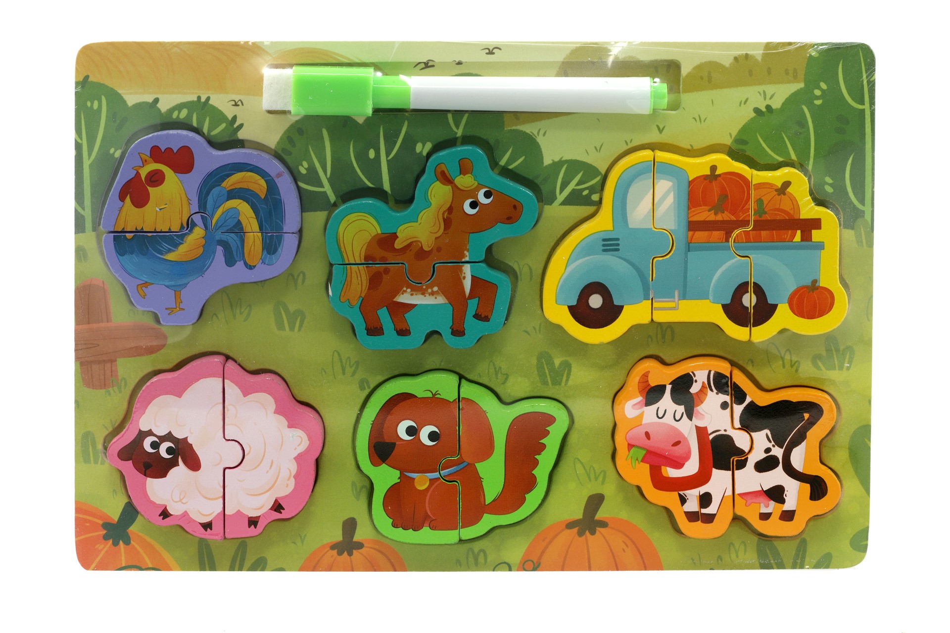 Ξύλινο παιδικό παζλ – πίνακας 22*15 εκ. σε διάφορα σχέδια. Στην μια πλευρά αποτελείται από παζλ με σφηνώματα 12 τεμαχίων σε διάφορα σχέδια ενώ στην πίσω από λευκό πίνακα και μαρκαδόρο με γόμα, για να μπορούν να δημιουργούν οι μικροί μας φίλοι. Κατάλληλο για παιδιά ηλικίας 2+.