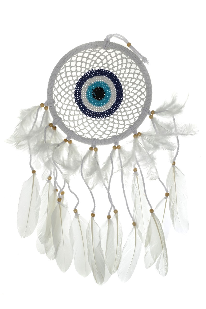 Χειροποίητη ονειροπαγίδα πλεκτή με σχέδιο μάτι διαστάσεων 22*56εκ. στολισμένη με χάνδρες και φτερά.